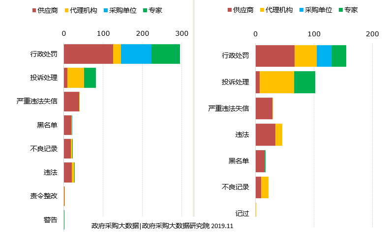 ②从各主体的失信处罚类型可看到:2019年1-10月代理机构投诉风险与上年同期相比明显高。严重违法失信和黑名单主要集中于供应商,其中弄虚作假和串通投标仍是供应商违法的“主力”。