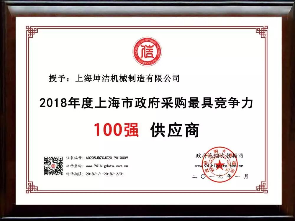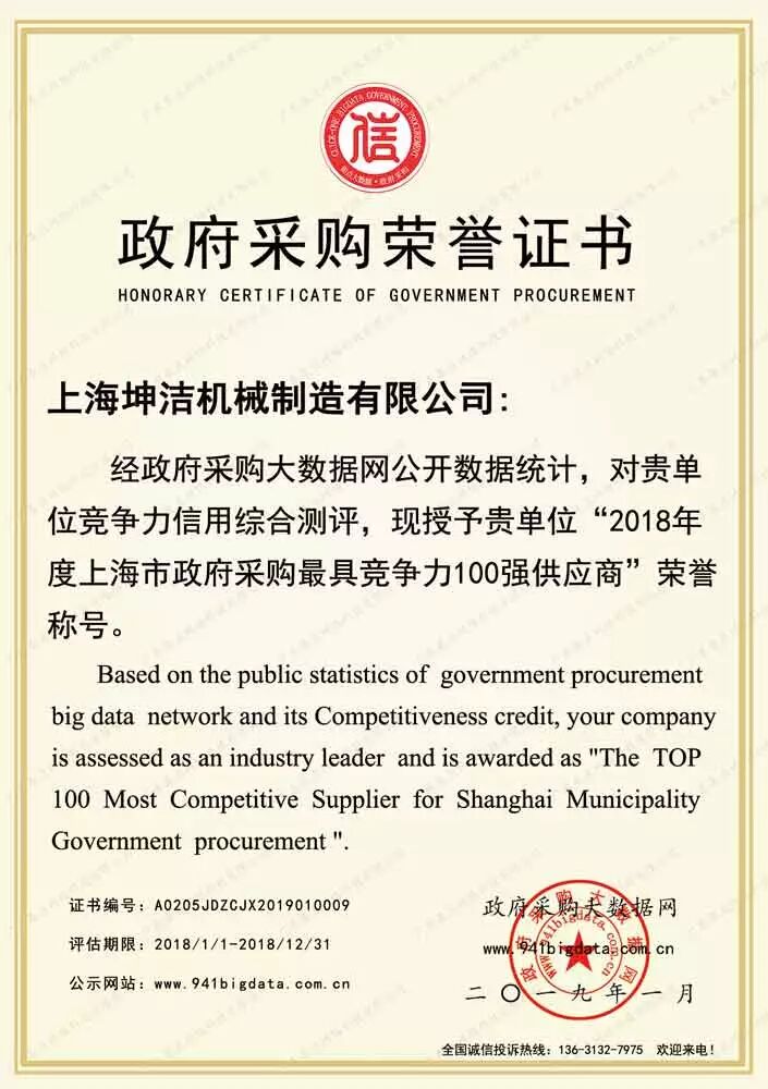 经政府采购大数据网&政府采购大数据研究院&广东集点网络科技有限公司三方联合评价,上海坤洁机械制造有限公司被第三方政府采购大数据信用评级机构“集点大数据信用”评定为2018年度上海市政府采购最具竞争力100强供应商!
