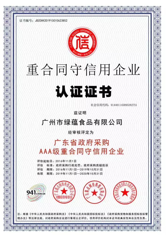 政府采购红名单|广州市绿蕴食品有限公司获重合同守信用AAA级