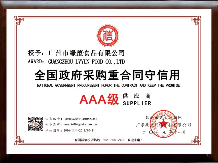 经政府采购大数据网&政府采购大数据研究院&广东集点网络科技有限公司三方联合评价,广州市绿蕴食品有限公司被第三方政府采购大数据信用评级机构“集点大数据信用”评定为全国政府采购重合同守信用AAA级供应商!