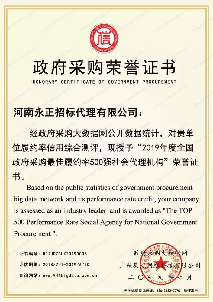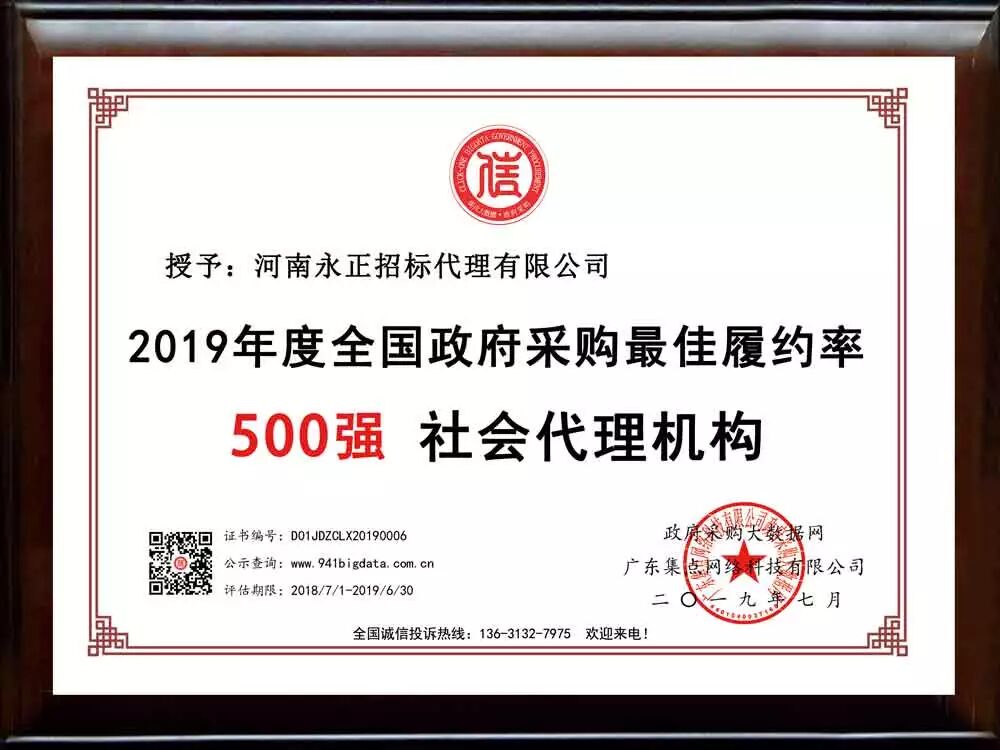 经政府采购大数据网&政府采购大数据研究院&广东集点网络科技有限公司三方联合评价,河南永正招标代理有限公司被第三方政府采购大数据信用评级机构“集点大数据信用”评定为2019年度全国政府采购最佳履约率500强社会代理机构!
