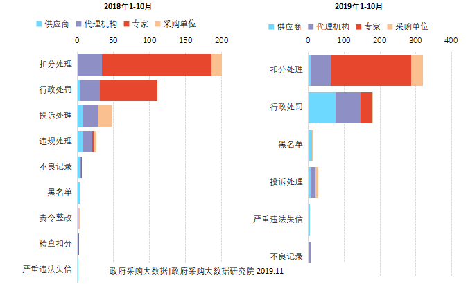 ②从各主体的失信处罚类型可看到:2019年1-10月扣分处理中专家比重超70%,可见,贵州省对专家的失信处罚以扣分处理为主。而行政处罚主要集中于供应商和代理机构。