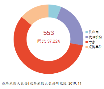 ①2019年1-10月份贵州政府采购失信处罚记录达到553条,比上年同期增长37.22%;其中评审专家处罚数量占比最大,达到58.23%;其次,代理机构比重为21.88%。失信处罚记录的大幅度增长,这不仅对参与政府采购的各主体起到震慑作用,同时有利于为政府采购打造良好的营商环境。