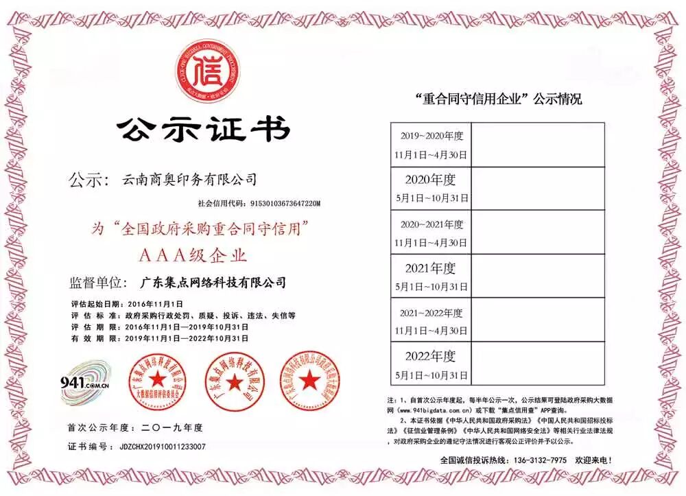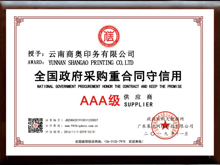 经政府采购大数据网&政府采购大数据研究院&广东集点网络科技有限公司三方联合评价,云南商奥印务有限公司被第三方政府采购大数据信用评级机构“集点大数据信用”评定为全国政府采购重合同守信用AAA级供应商!