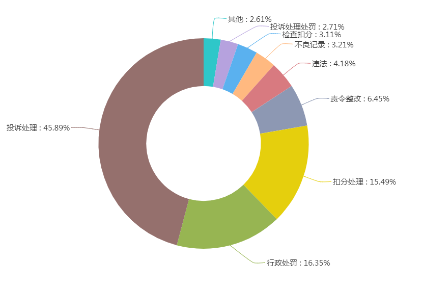 数据显示,2019年1-10月期间代理机构三大处罚类型中投诉处理达到1300多条记录,所占比重最大;其次是行政处罚占比16.35%,扣分处理15.49%。