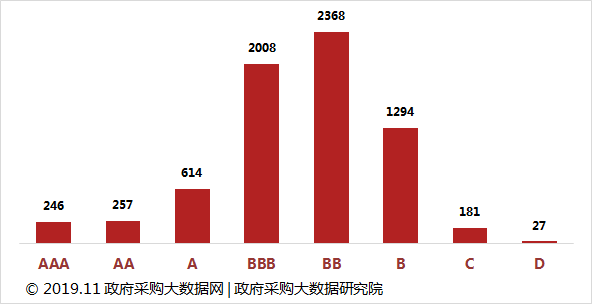 四川政府采购服务质量企业总体样本容量高达6995家,其中A级及以上信用等级单位1117家,占总体样本的15.97%。B级及以上信用等级单位6787家,占总体样本的97.03%。从数据可见,四川政府采购各行业绝大部分企业服务质量信用表现良好。