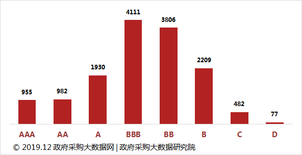 浙江政府采购服务质量企业总体样本容量高达14552家,其中A级及以上信用等级单位3967家,占总体样本的26.57%。B级及以上信用等级单位13993家,占总体样本的96.16%,其中69.58%的企业属于BBB-B等级。从数据可见,浙江政府采购各行业绝大部分企业服务质量信用表现良好。