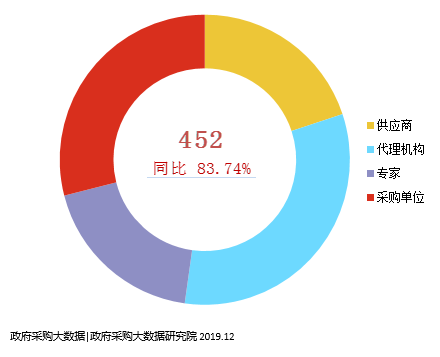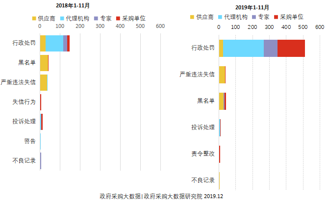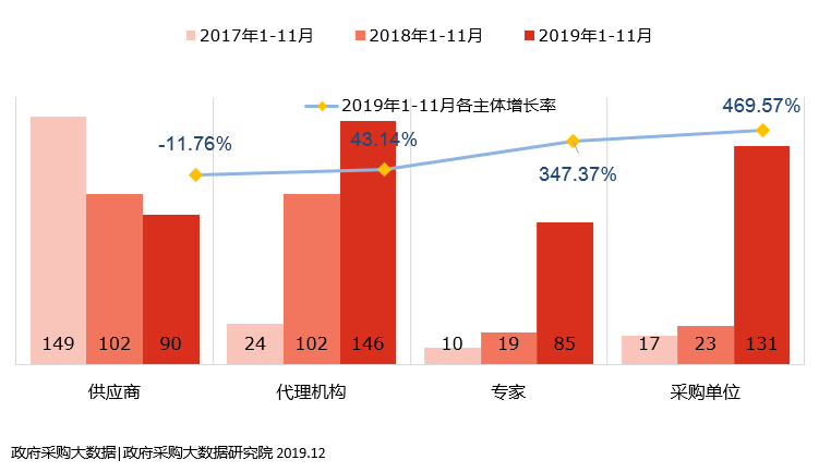 数据显示,2019年1-11月采购单位失信数量增长迅速,高达469.57%;同时评审专家失信增长速度也不容忽视,增长347.37%;由此可知,各执法部门加大对采购单位和专家的处罚力度。