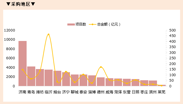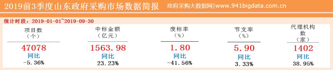 ①总体概况:2019年前三季度山东政府采购项目数达到47078个,与去年同比减少了5.36%,而采购金额较上年同期增长23.23%;从政府采购市场规模来看,呈现出稳定发展的态势。