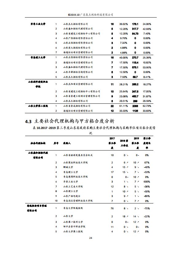 ③代理机构现状:山东政府采购代理机构市场迅速发展,2019年代理机构数增速达到38.95%,大量代理机构进入该行业瓜分市场份额。可见,增强自身执业水平以及提高代理服务质量显得尤其重要。