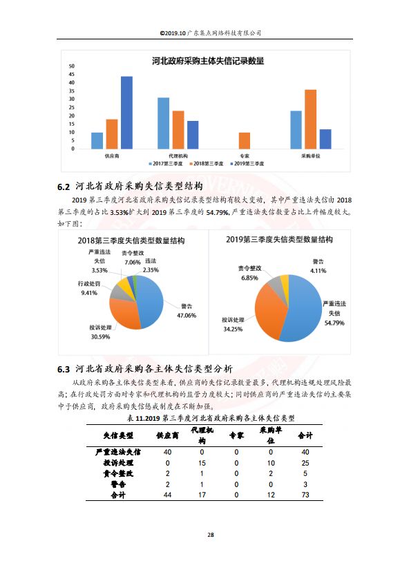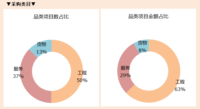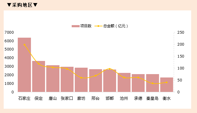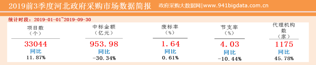①总体概况:2019年前三季度河北政府采购项目数达到33044个,与去年同比增长了11.87%,但采购金额较上年同期减少了30.34%;从市场规模来看,河北省政府采购市场有所缩小。