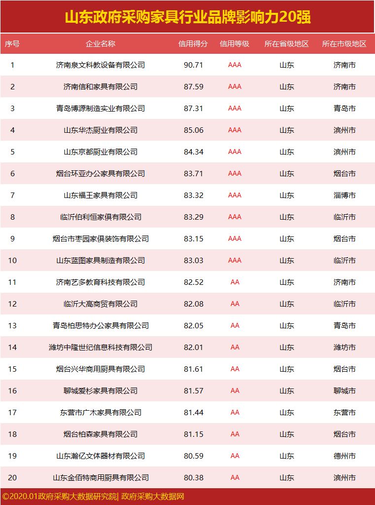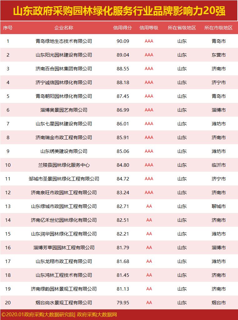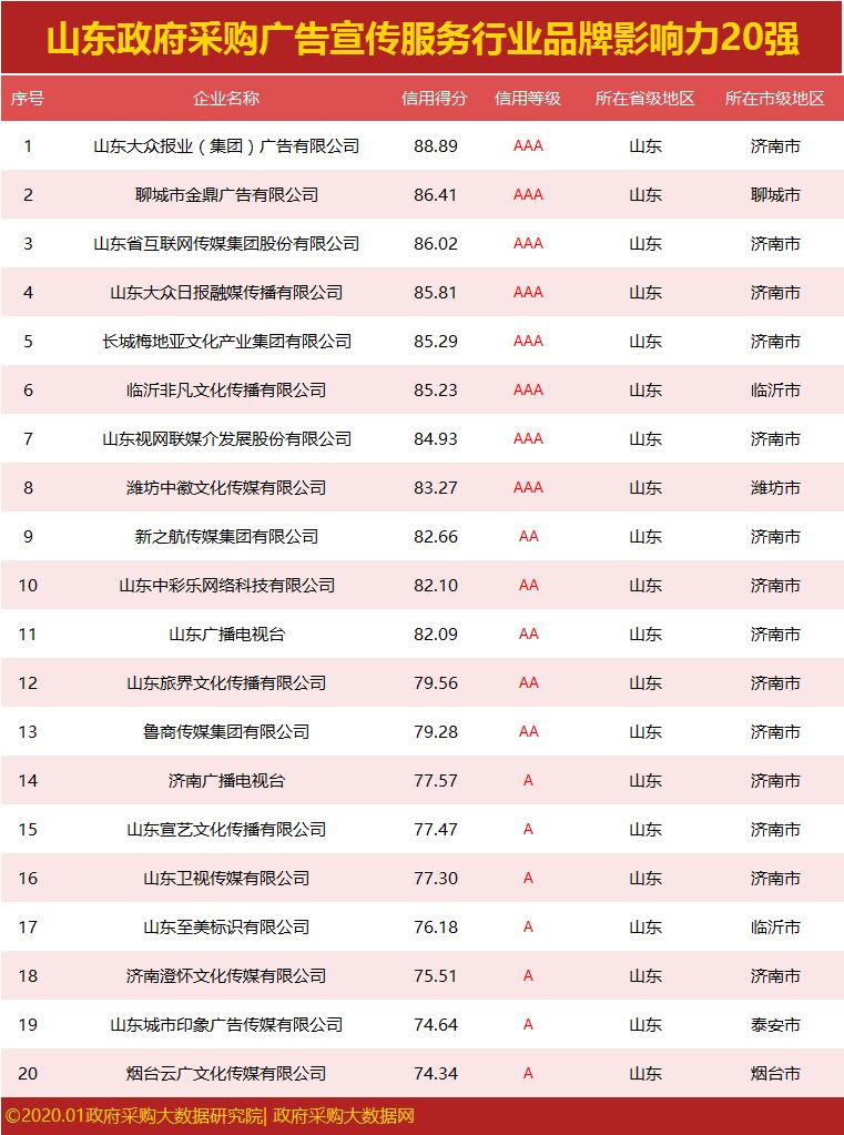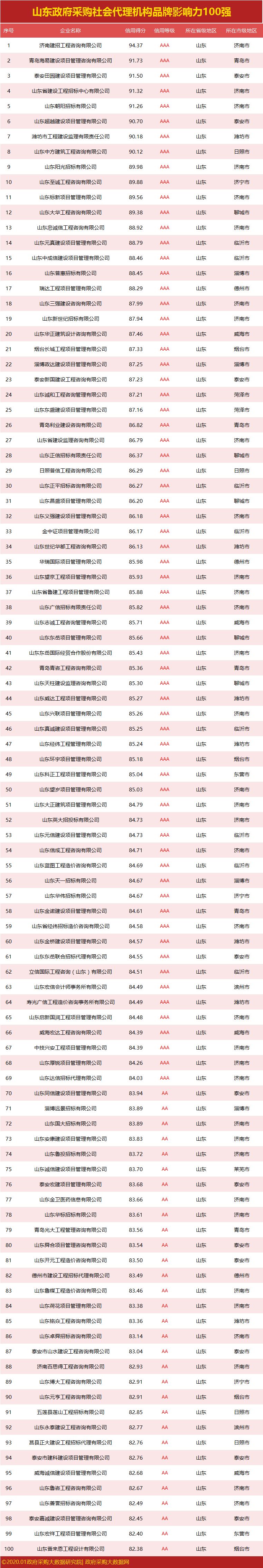 政府采购大数据研究院和政府采购大数据网联合发布:山东省政府采购社会代理机构品牌影响力100强&行业20强。评估时段为:2018年12月01日至2019年11月30日。公示日期为:2020年01月09日至2020年01月15日。