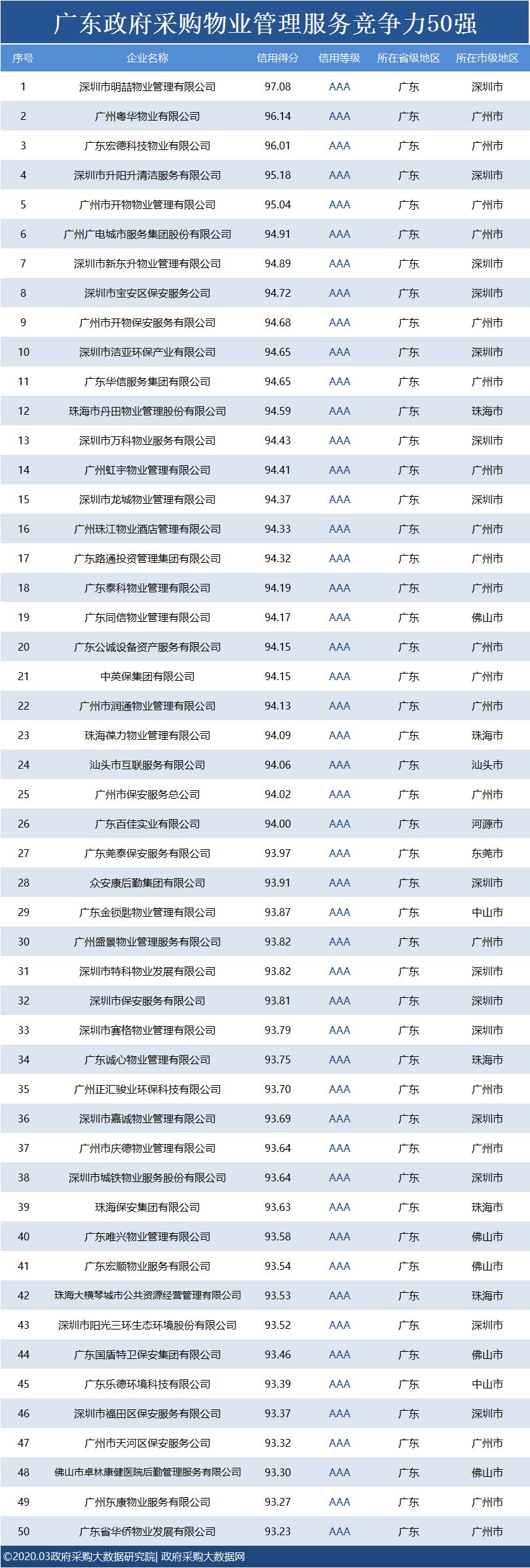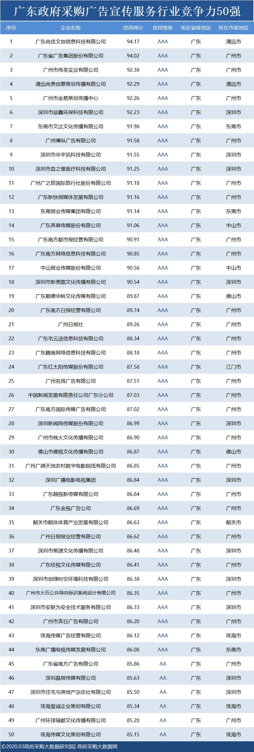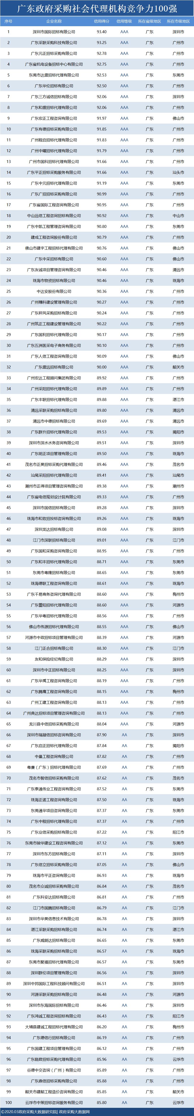 政府采购大数据研究院和政府采购大数据网联合发布:广东政府采购社会代理机构竞争力100强&行业竞争力50强。数据评估区间:2019年01月01日至2019年12月31日。公示时间:2020年03月11日至2020年03月17日。