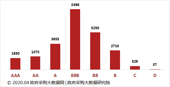 广东省政府采购服务质量企业信用等级AAA级共有1650家,占总体样本的6.8%。A级及以上信用等级单位7183家,占总体样本的29.61%。B级及以上信用等级单位23639家,占总体样本的97.46%。数据显示,广东省政府采购服务质量评估企业的信用状况整体上表现良好。