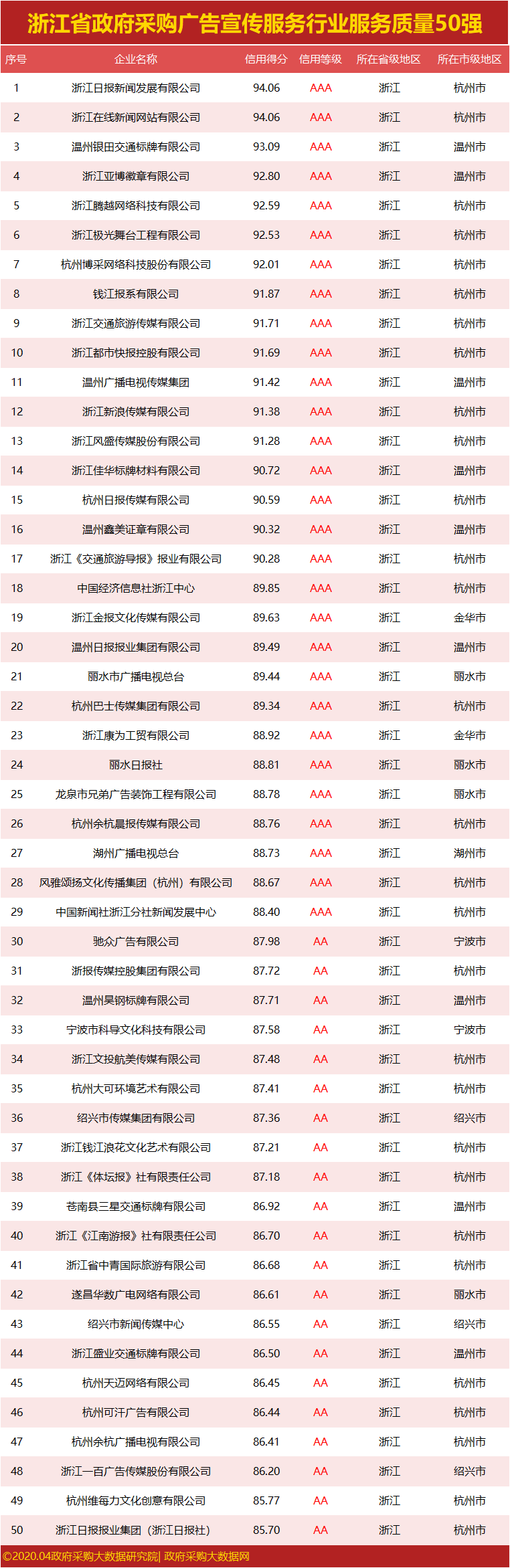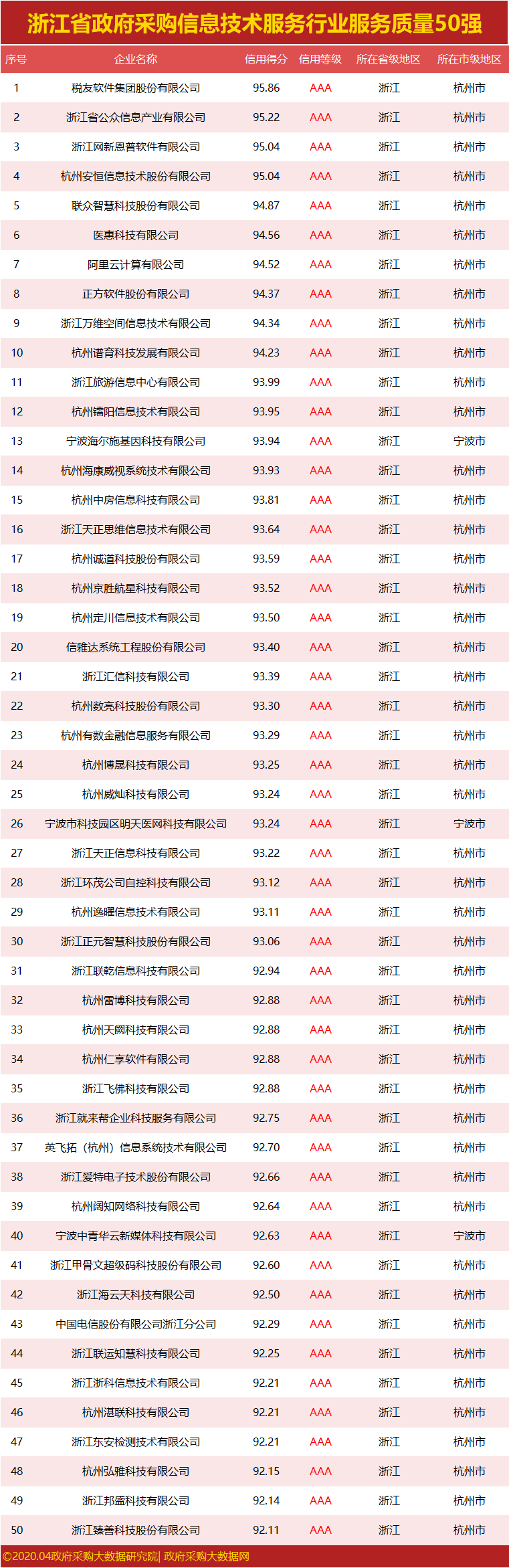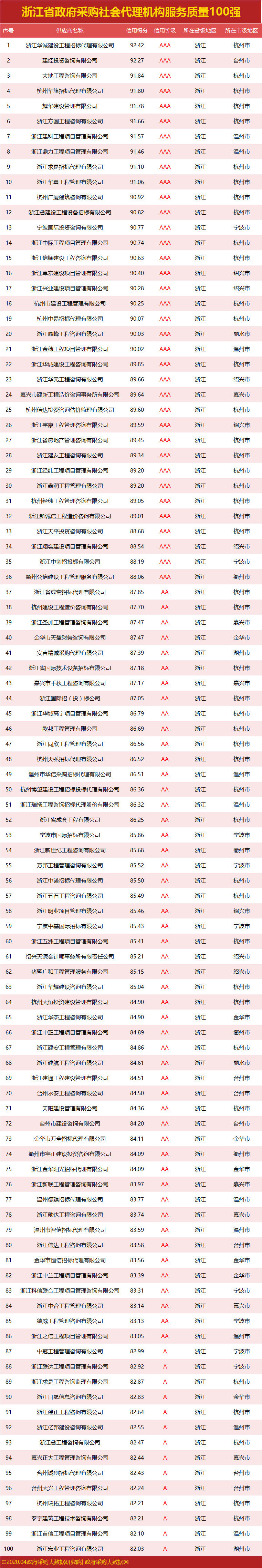 ③政府采购大数据研究院和政府采购大数据网联合发布:浙江省政府采购社会代理机构服务质量100强&行业供应商服务质量50强榜单。数据评估区间:2019年04月01日至2020年03月31日。公示时间:2020年04月23日至2020年04月29日。