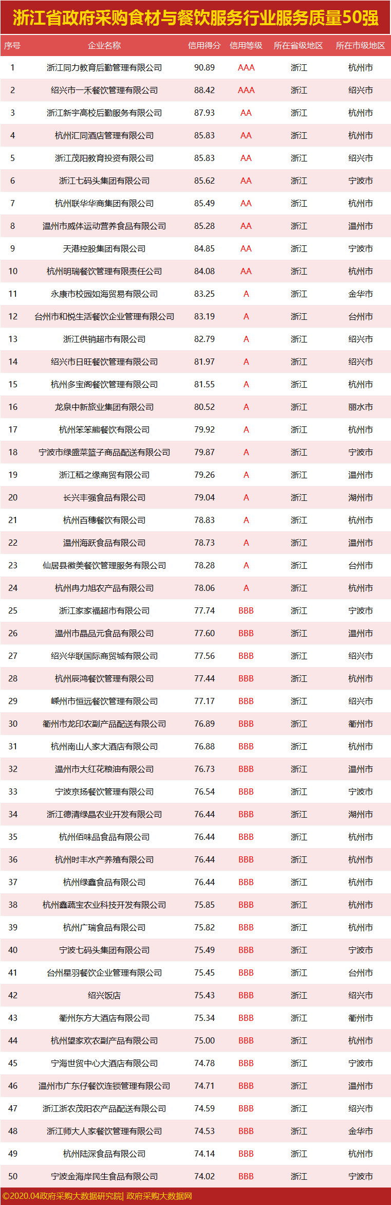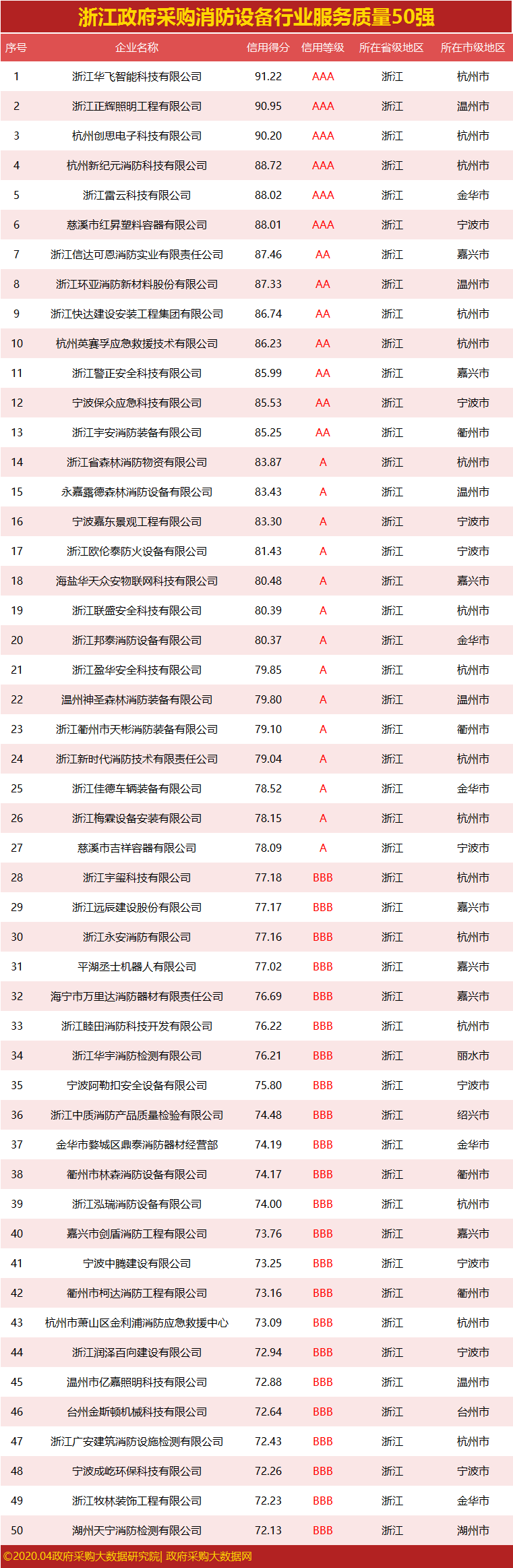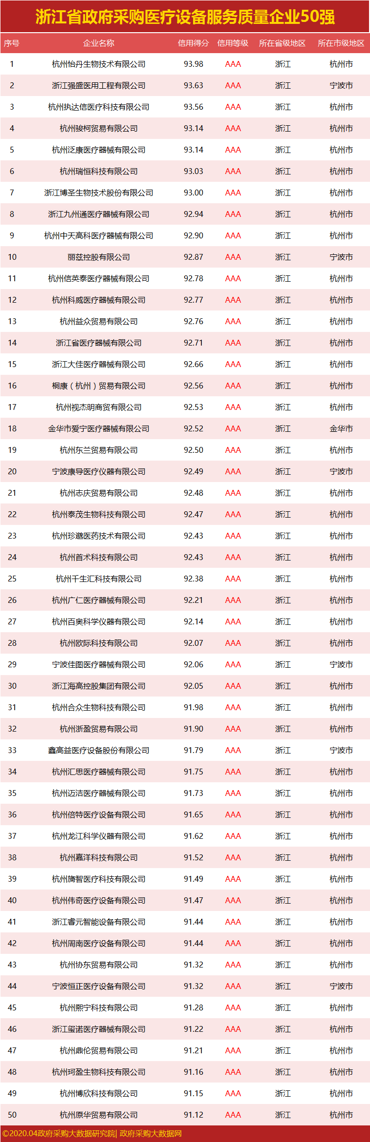 ③政府采购大数据研究院和政府采购大数据网联合发布:浙江省政府采购社会代理机构服务质量100强&行业供应商服务质量50强榜单。数据评估区间:2019年04月01日至2020年03月31日。公示时间:2020年04月23日至2020年04月29日。