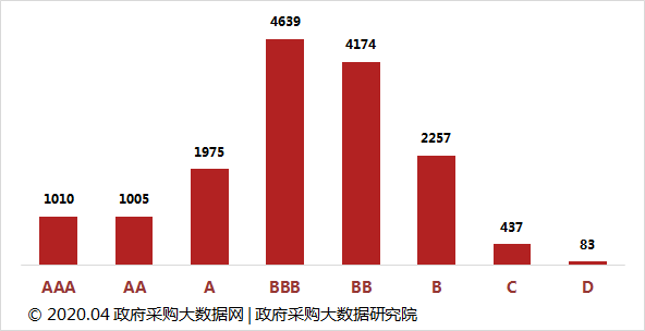 浙江省政府采购服务质量企业信用等级AAA级共有1010家,占总体样本的6.48%。A级及以上信用等级单位3990家,占总体样本的25.61%。B级及以上信用等级单位15060家,占总体样本的96.66%。数据显示,浙江省政府采购服务质量评估企业的信用状况整体上表现良好。
