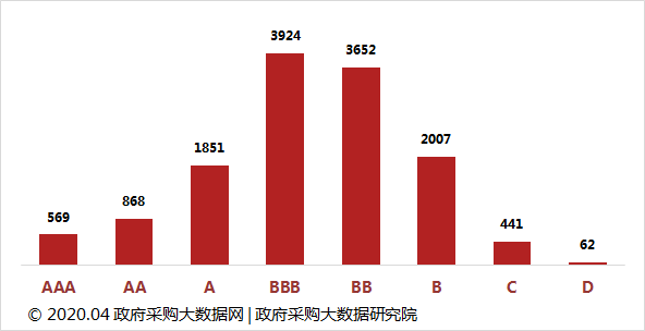 福建省政府采购服务质量企业信用等级AAA级共有569家,占总体样本的4.25%。A级及以上信用等级单位3288家,占总体样本的24.59%。B级及以上信用等级单位12871家,占总体样本的96.24%。数据显示,福建省政府采购服务质量评估企业的信用状况整体上表现良好。