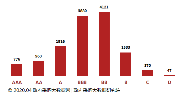 广西政府采购服务质量企业信用等级AAA级共有776家,占总体样本的5.7%。A级及以上信用等级单位3655家,占总体样本的26.86%。B级及以上信用等级单位13189家,占总体样本的96.94%。数据显示,广西政府采购服务质量评估企业的信用状况整体上表现良好。