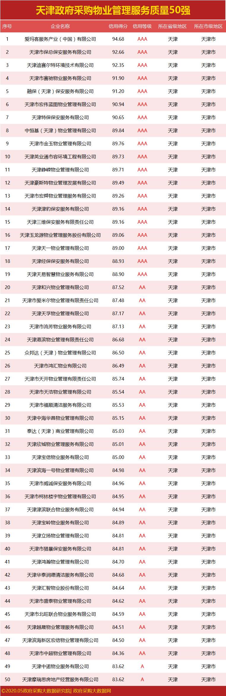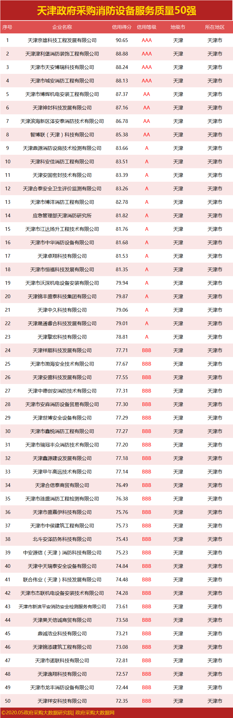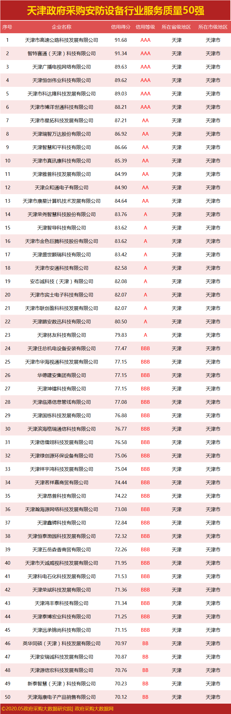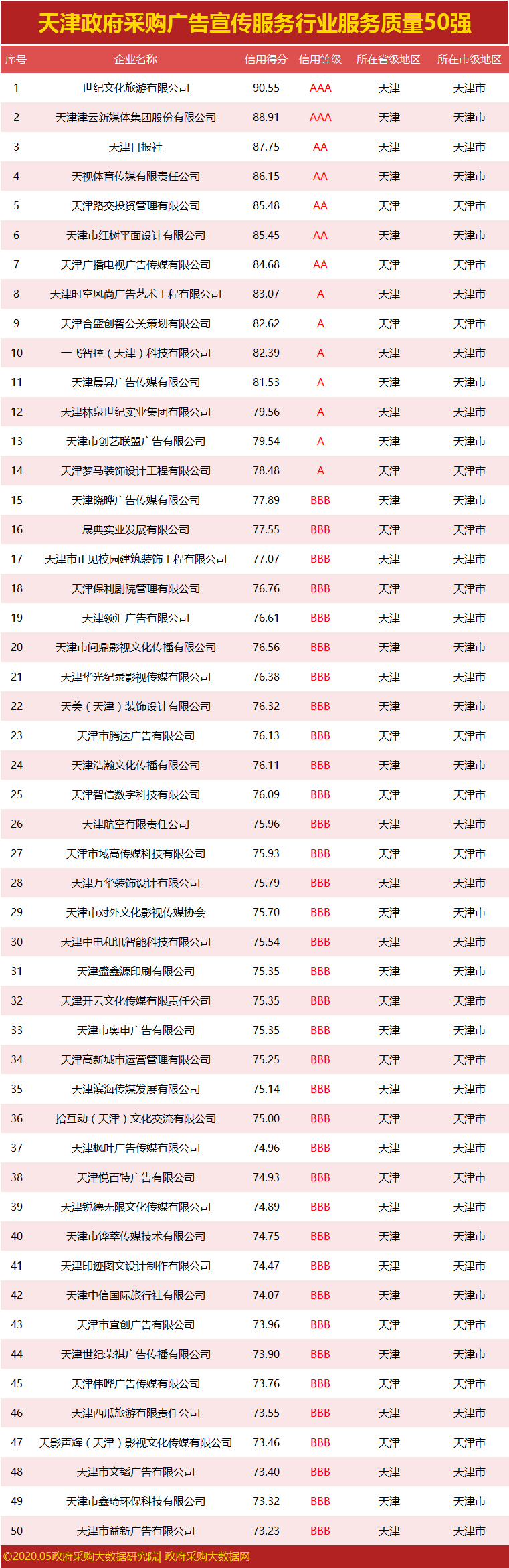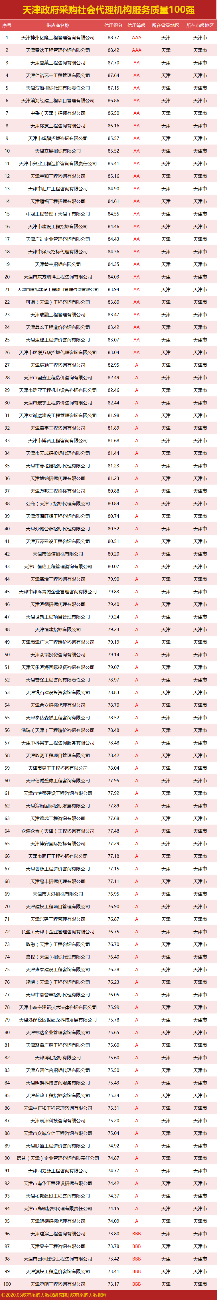 ③政府采购大数据研究院和政府采购大数据网联合发布:天津市政府采购社会代理机构服务质量100强&行业供应商服务质量50强榜单。数据评估区间:2019年04月01日至2020年03月31日。公示时间:2020年05月08日至2020年05月14日。