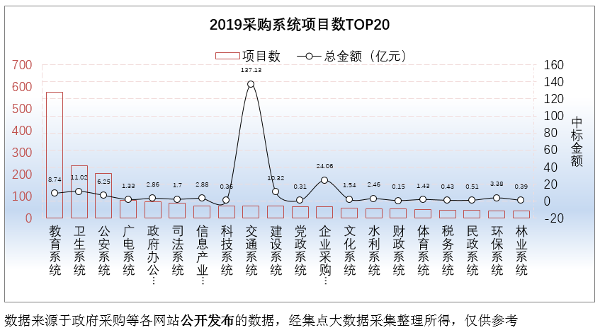 教育系统采购项目数576个,占比项目总数的26.16%,项目金额8.74亿元,占比项目总金额的3.76%;