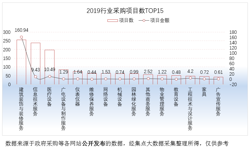 从采购项目数TOP15细分行业来看,采购数量前三行业主要是: