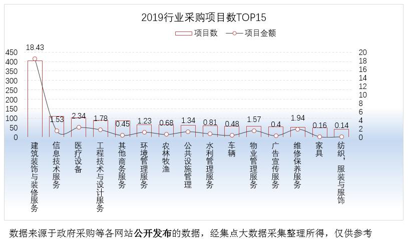 从采购项目数TOP15细分行业来看,采购数量前三行业主要是: