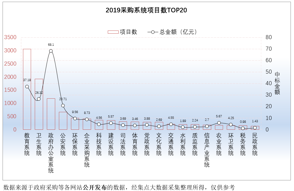 教育系统采购项目数3053个,占比项目总数的24.38%,项目金额37.18亿元,占比项目总金额的15.44%;