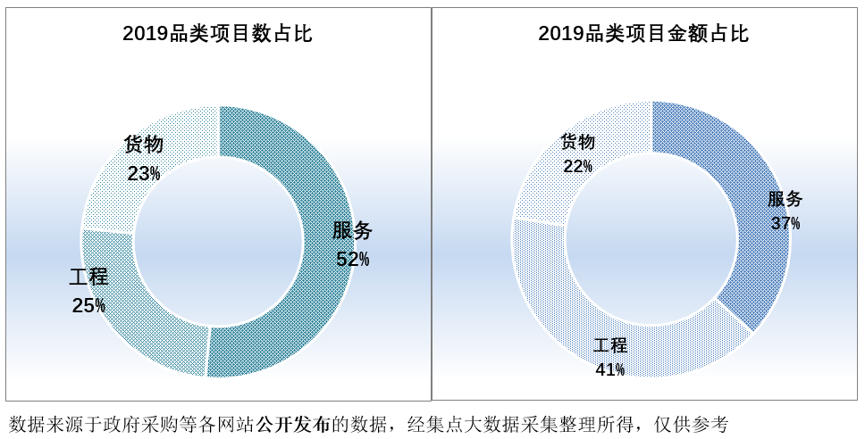 2019年度杭州市服务类采购项目数6420个,占比项目总数的51.52%,项目金额88.51亿元,占比项目总金额的36.90%;