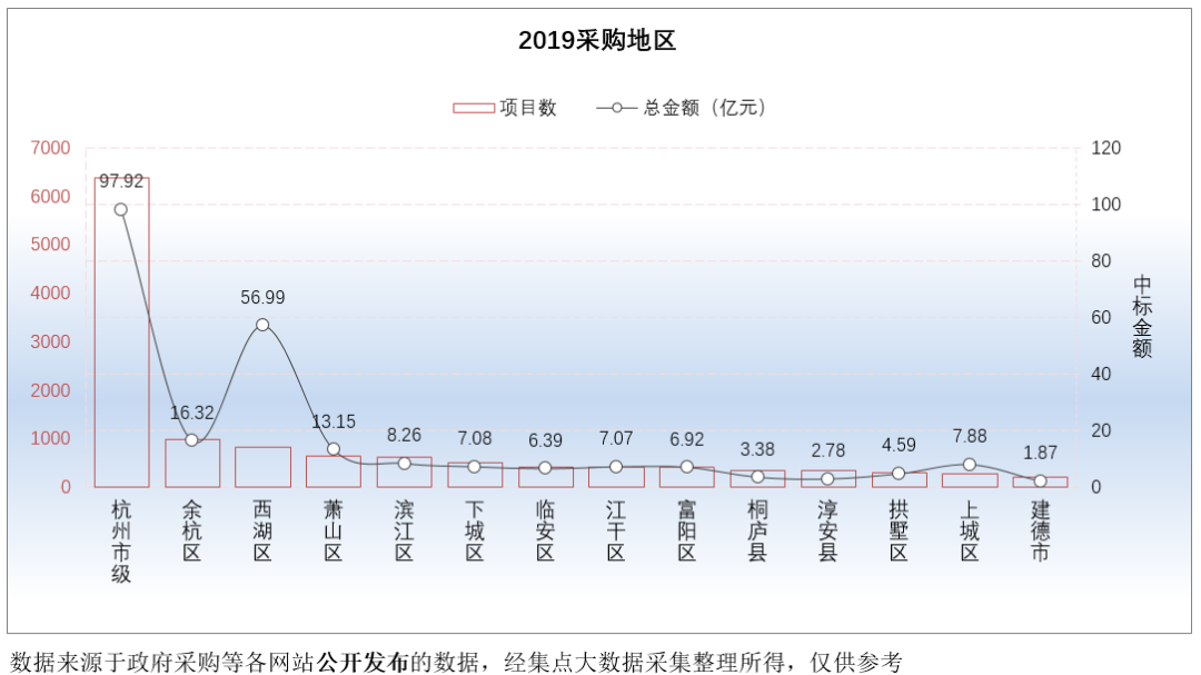 在浙江省11个地级市中,杭州市政府采购项目数量排名1名,项目金额排名2名。