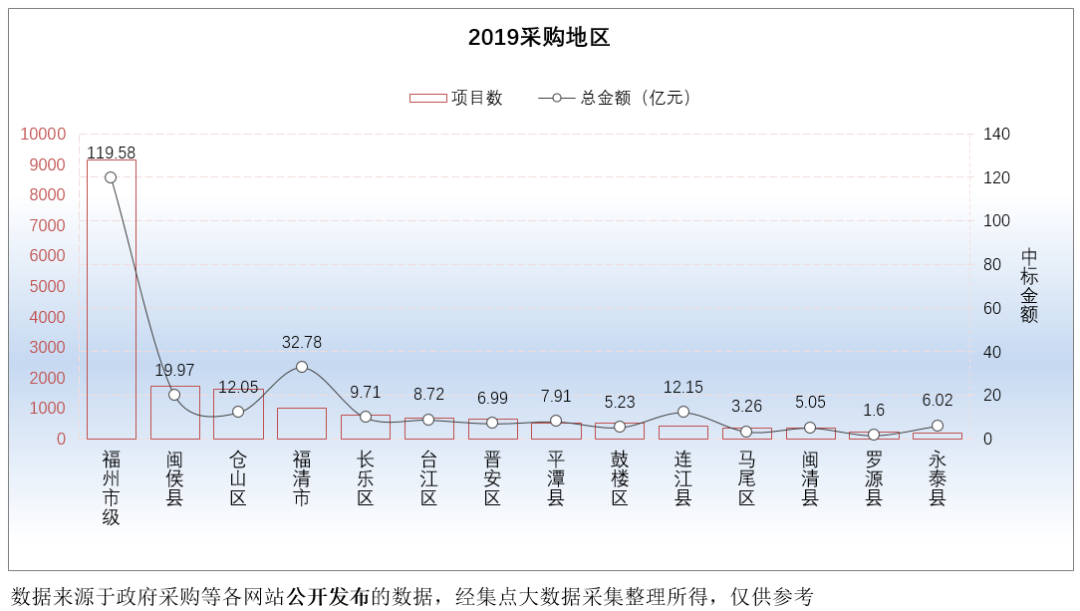 福州市级采购项目数9127个,占比项目总数的50.31%,项目金额119.58亿元,占比项目总金额的47.64%;