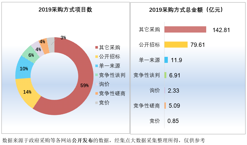 公开招标采购项目数2603个,占比项目总数的14.47%,项目金额79.61亿元,占比项目总金额的31.91%;