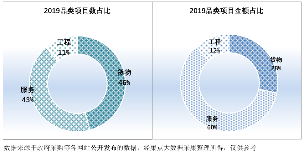 服务类采购项目数7630个,占比项目总数的42.86%,项目金额150.27亿元,占比项目总金额的59.88%;