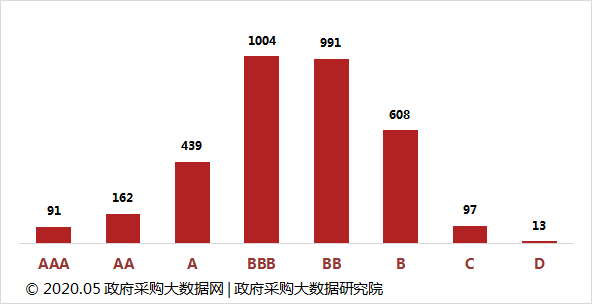 宁夏政府采购服务质量企业信用等级AAA级共有91家,占总体样本的2.67%。A级及以上信用等级单位692家,占总体样本的20.32%。B级及以上信用等级单位3295家,占总体样本的96.77%。数据显示,宁夏政府采购服务质量评估企业的信用状况整体上表现良好。