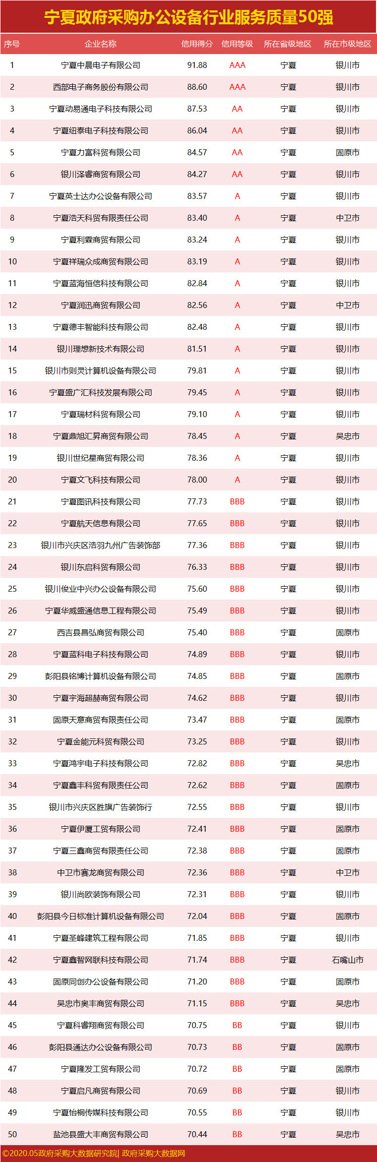③政府采购大数据研究院和政府采购大数据网联合发布:宁夏政府采购社会代理机构服务质量100强&行业供应商服务质量50强榜单。数据评估区间:2019年04月01日至2020年03月31日。公示时间:2020年05月20日至2020年05月26日。