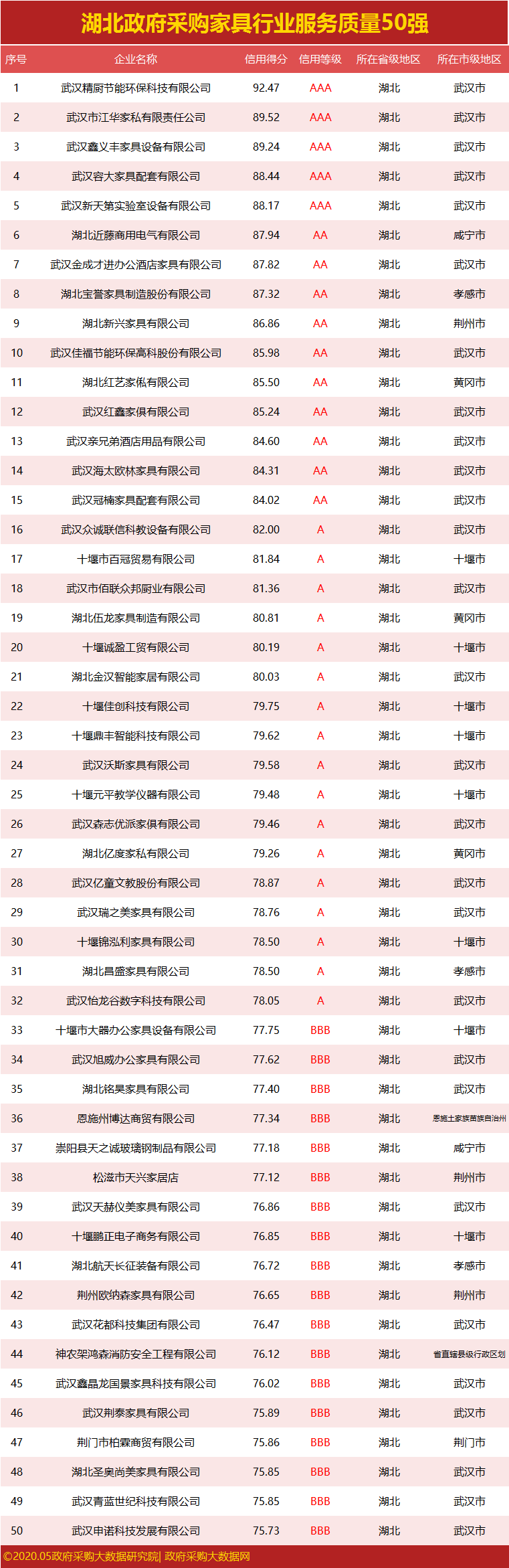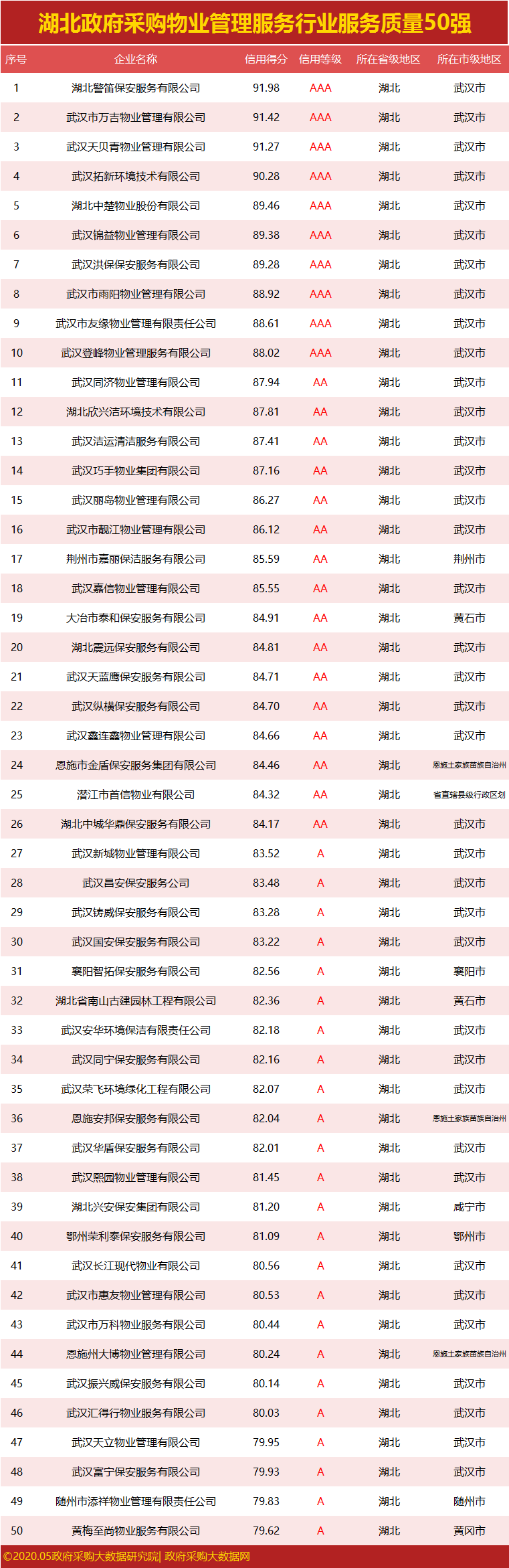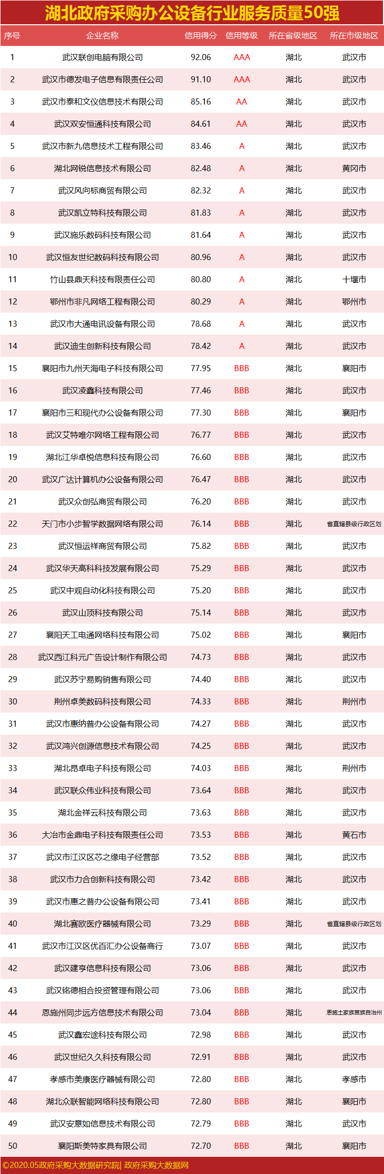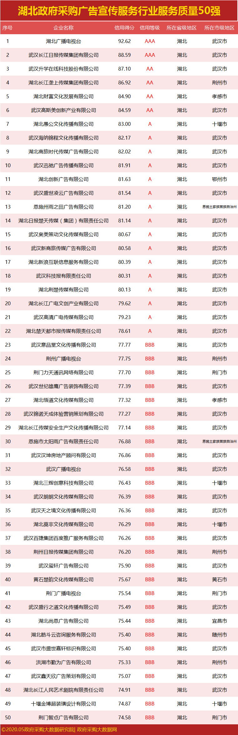 ③政府采购大数据研究院和政府采购大数据网联合发布:湖北省政府采购社会代理机构服务质量100强&行业供应商服务质量50强榜单。数据评估区间:2019年04月01日至2020年03月31日。公示时间:2020年05月22日至2020年05月28日。
