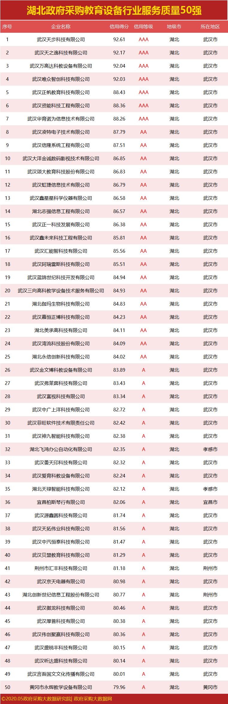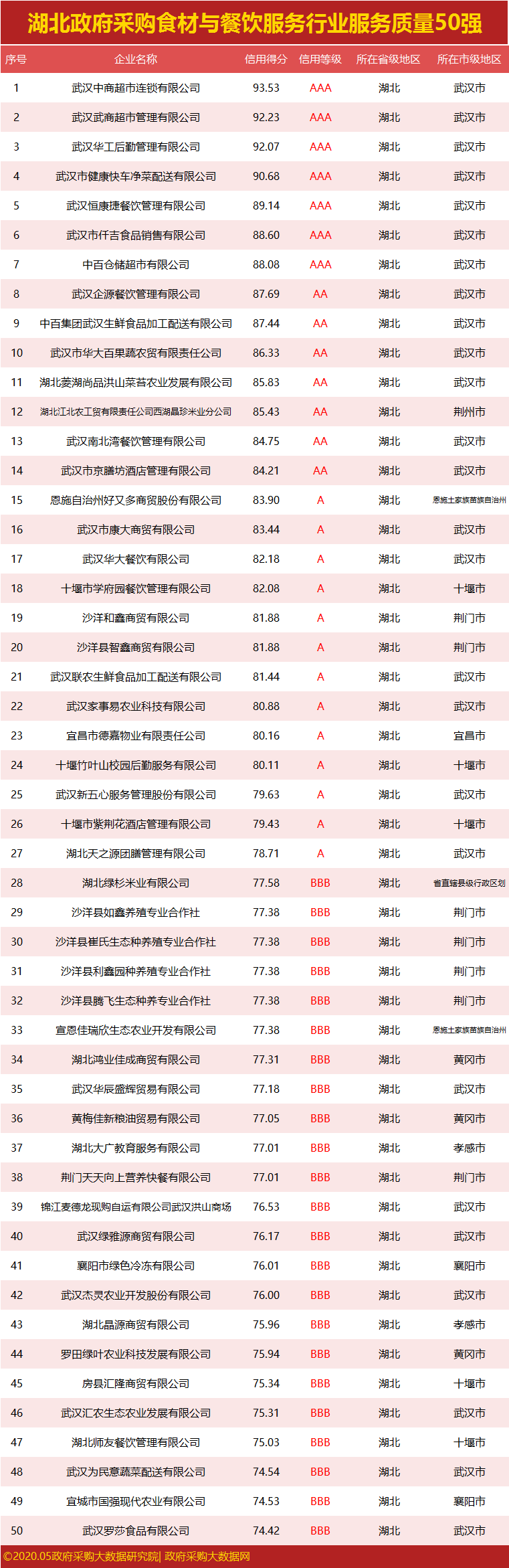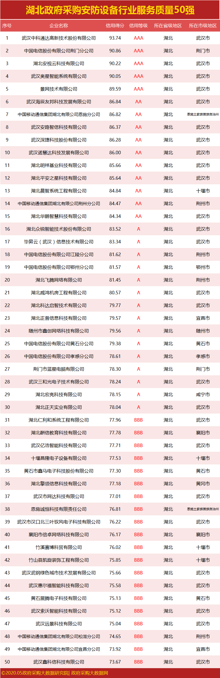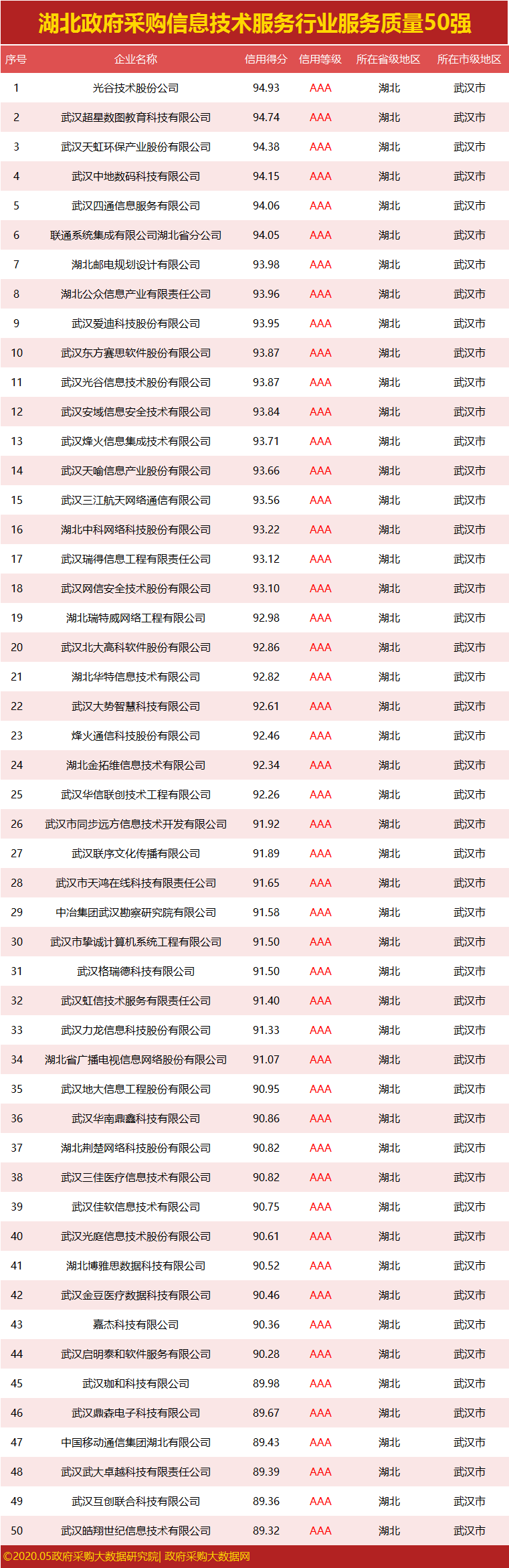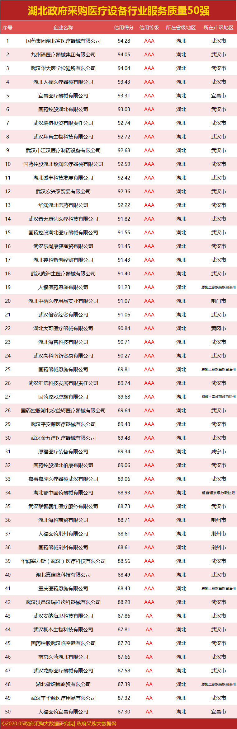 ③政府采购大数据研究院和政府采购大数据网联合发布:湖北省政府采购社会代理机构服务质量100强&行业供应商服务质量50强榜单。数据评估区间:2019年04月01日至2020年03月31日。公示时间:2020年05月22日至2020年05月28日。