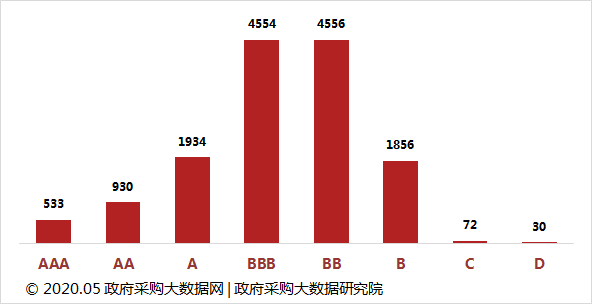 湖北省政府采购服务质量企业信用等级AAA级共有533家,占总体样本的3.68%。A级及以上信用等级单位3397家,占总体样本的23.48%。B级及以上信用等级单位14363家,占总体样本的99.29%。数据显示,湖北省政府采购服务质量评估企业的信用状况整体上表现良好。