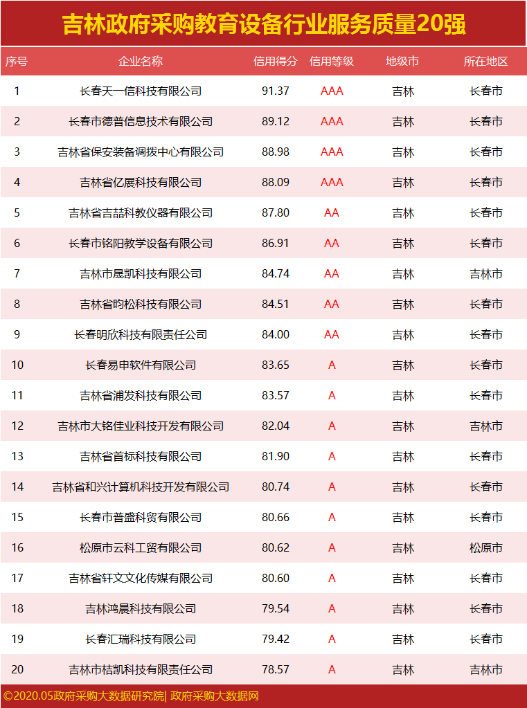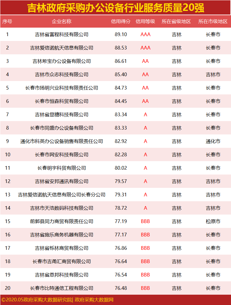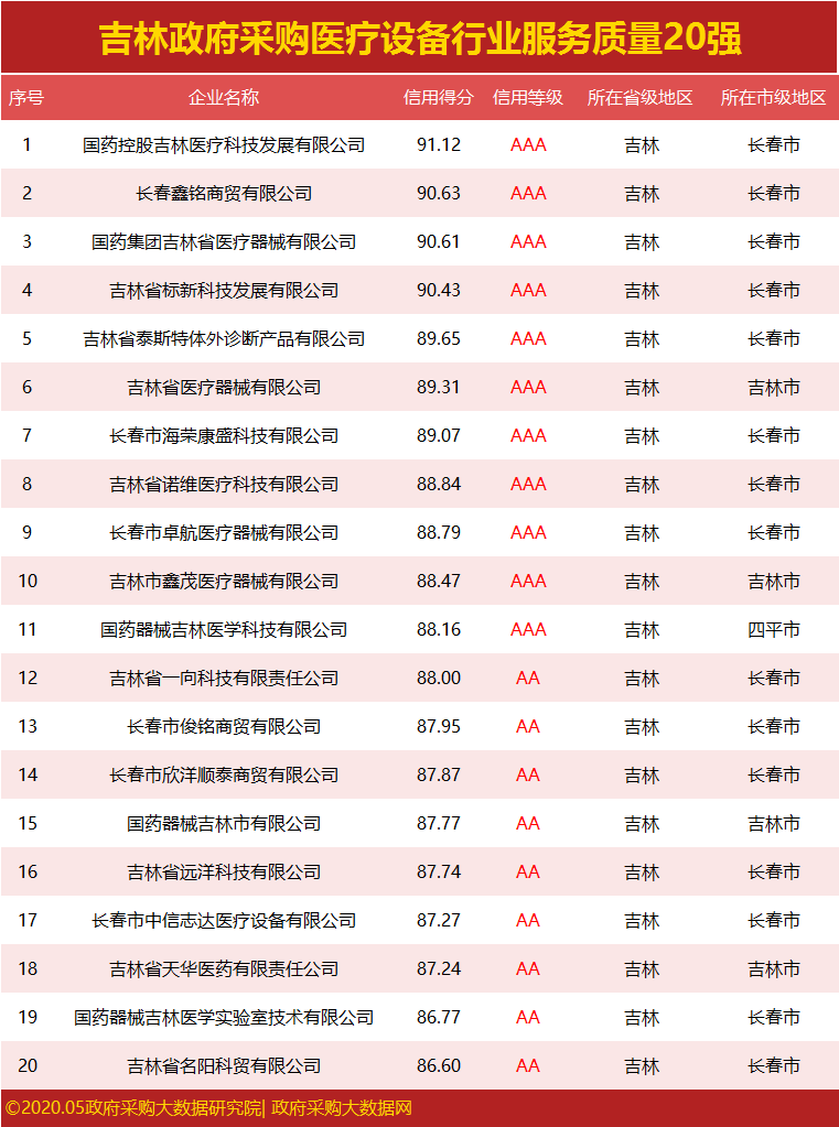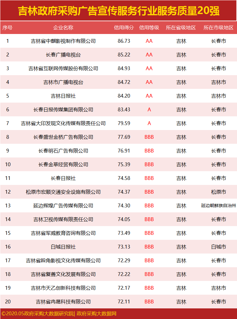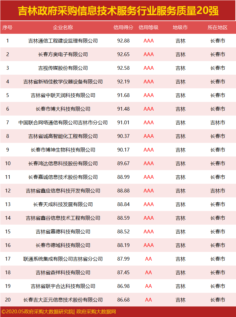 ③政府采购大数据研究院和政府采购大数据网联合发布:吉林省政府采购社会代理机构服务质量100强&行业供应商服务质量20强榜单。数据评估区间:2019年04月01日至2020年03月31日。公示时间:2020年05月24日至2020年05月30日。