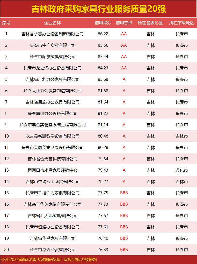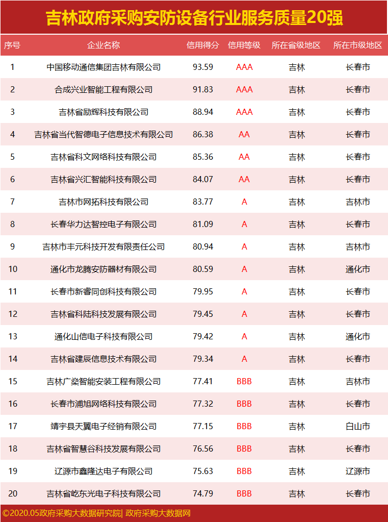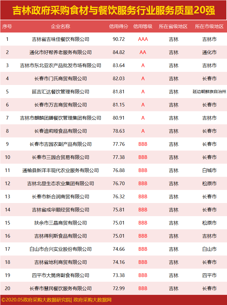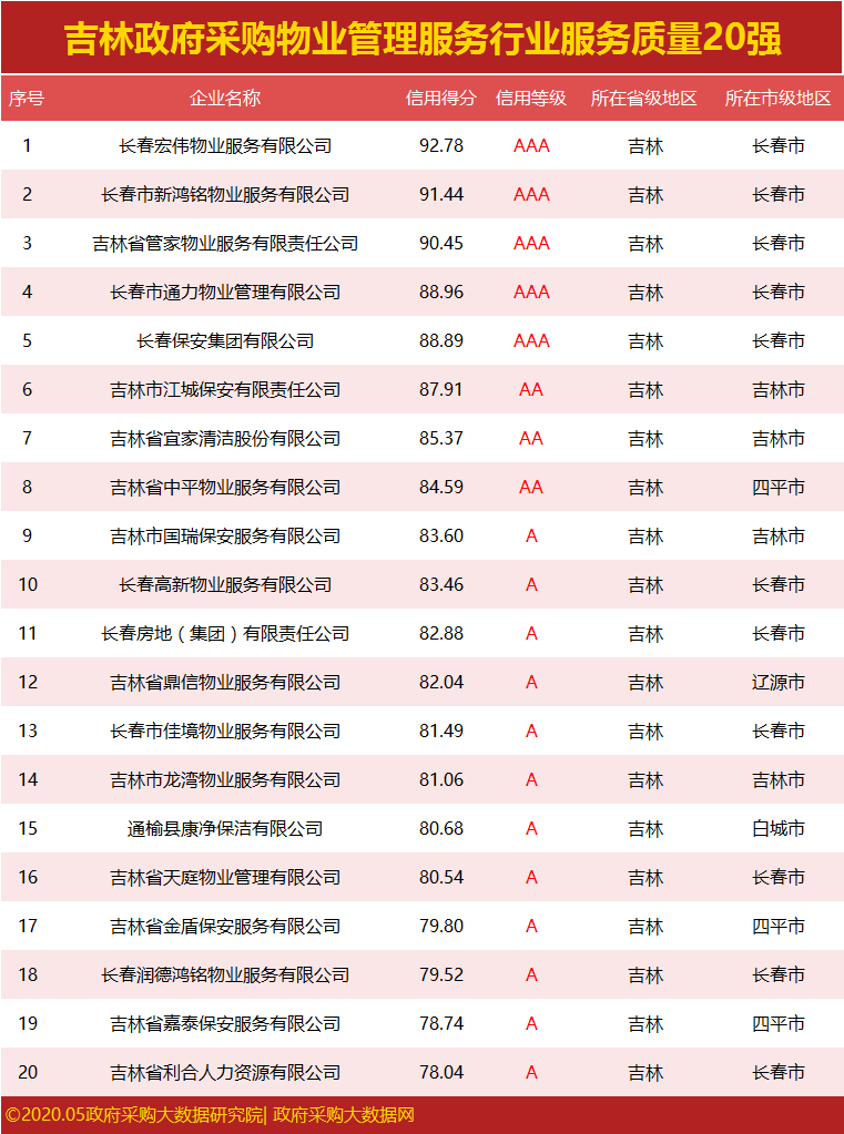 ③政府采购大数据研究院和政府采购大数据网联合发布:吉林省政府采购社会代理机构服务质量100强&行业供应商服务质量20强榜单。数据评估区间:2019年04月01日至2020年03月31日。公示时间:2020年05月24日至2020年05月30日。