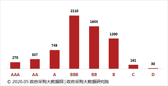 吉林省政府采购服务质量企业信用等级AAA级共有270家,占总体样本的4.09%。A级及以上信用等级单位1406家,占总体样本的21.32%。B级及以上信用等级单位6404家,占总体样本的97.1%。数据显示,吉林省政府采购服务质量评估企业的信用状况整体上表现良好。