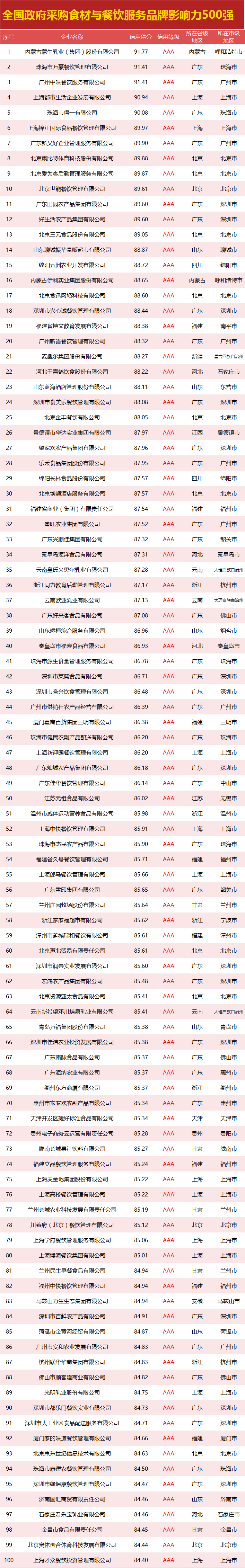 独家发布|全国政府采购食材餐饮品牌影响力500强花落谁家?