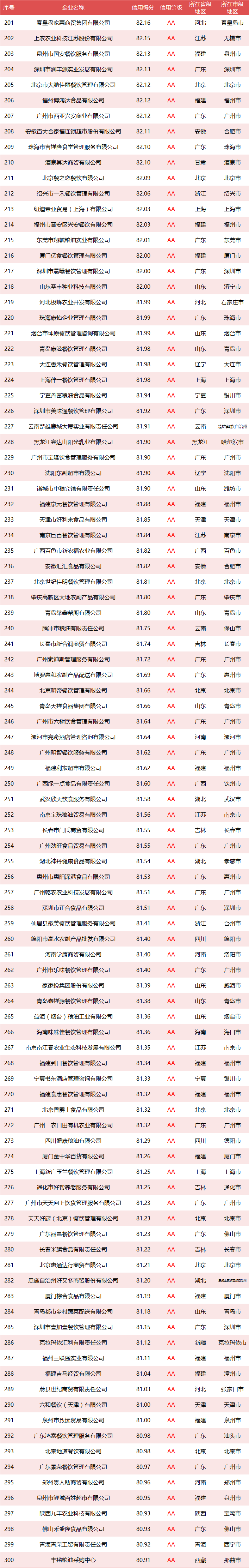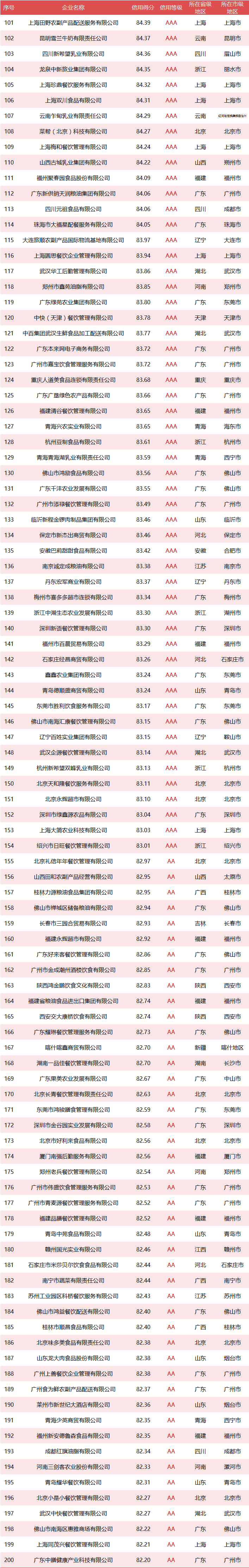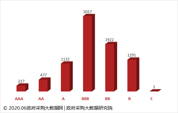 本次全国政府采购食材与餐饮供应商总体样本容量为8117家,达到AAA信用等级单位共计237家,占总体样本的2.92%。A级及以上信用等级单位1846家,占总体样本的22.74%。B级及以上信用等级单位8116家,占总体样本的99.99%。数据显示,全国政府采购食材与餐饮供应商整体上品牌影响力资信状况良好。