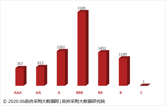 本次全国政府采购物业管理供应商总体样本容量为8912家,达到AAA信用等级单位共计767家,占总体样本的8.61%。A级及以上信用等级单位3081家,占总体样本的34.57%。B级及以上信用等级单位8911家,占总体样本的99.99%。数据显示,全国政府采购物业管理供应商整体上品牌影响力资信状况良好。
