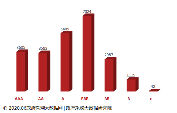 本次广东省政府采购企业总体样本容量为23840家,其中,AAA等级单位共计3685家,占总体样本的15.46%。A级及以上信用等级单位12672家,占总体样本的53.15%。B级及以上信用等级单位23798家,占总体样本的99.82%。数据显示,广东省政府采购企业整体上品牌影响力资信状况良好。