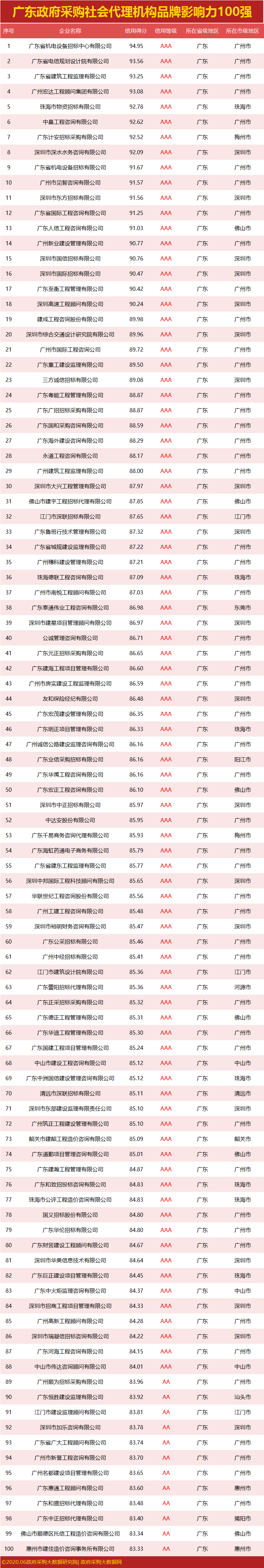 上榜企业是长期稳居榜单的强手,还是新晋“亮相”的黑马?一起来揭晓广东省政府采购社会代理机构&物业管理服务&食材与餐饮服务品牌影响力100强!您企业在榜单上吗?