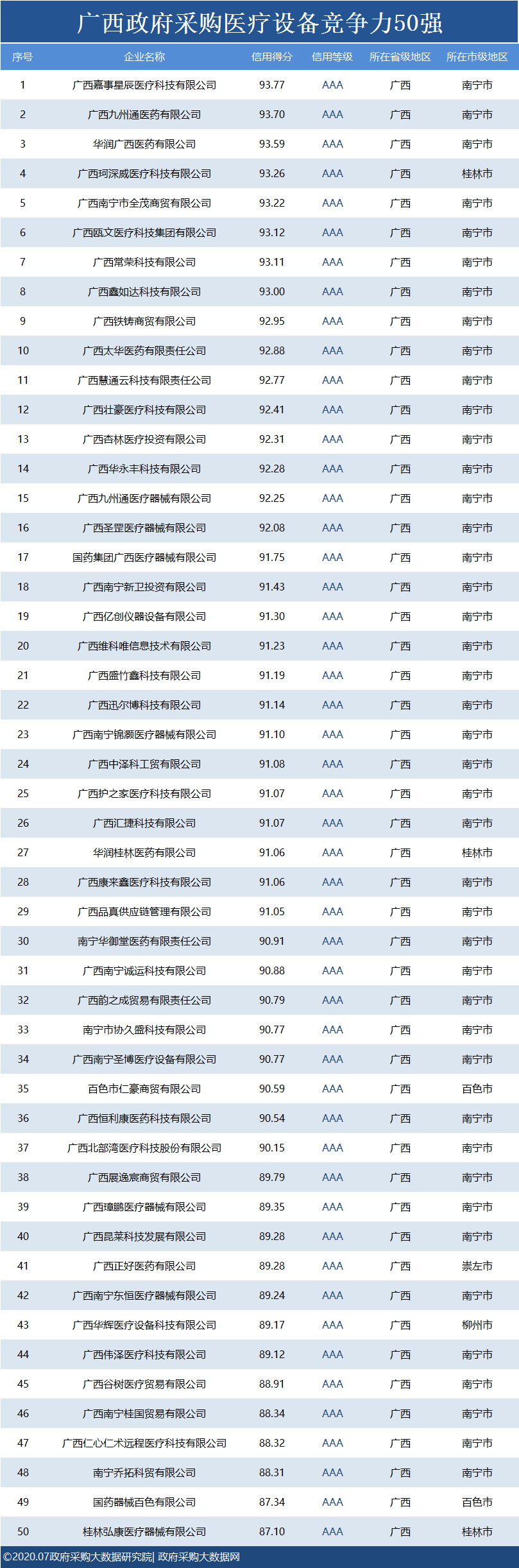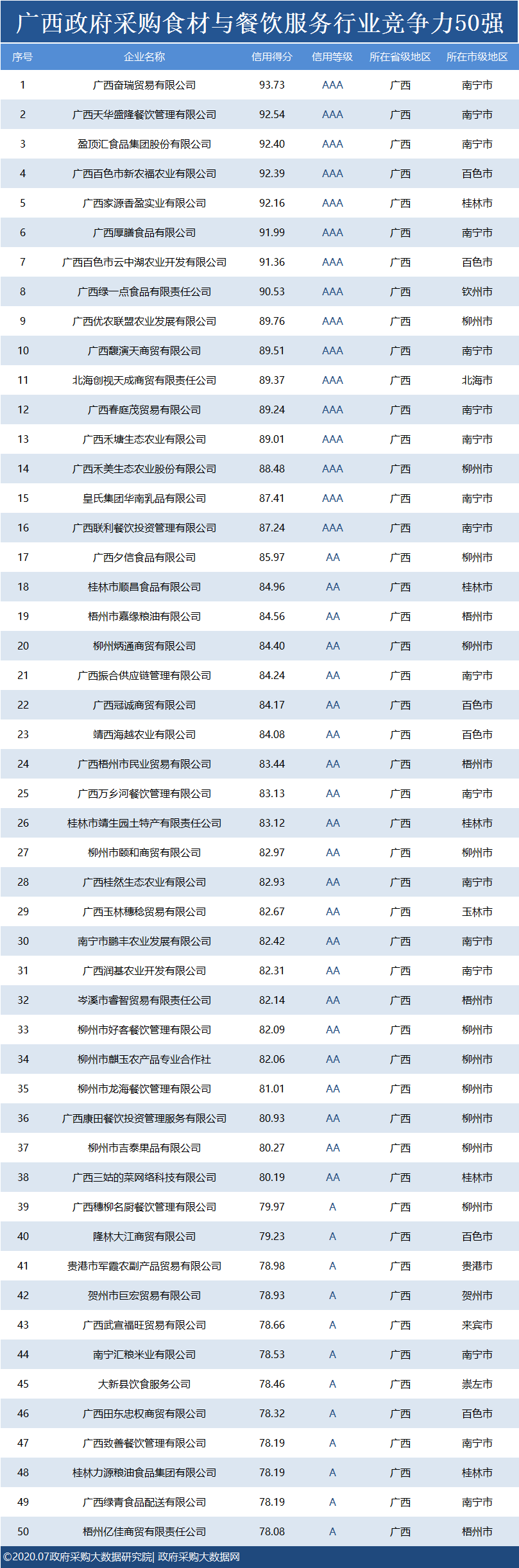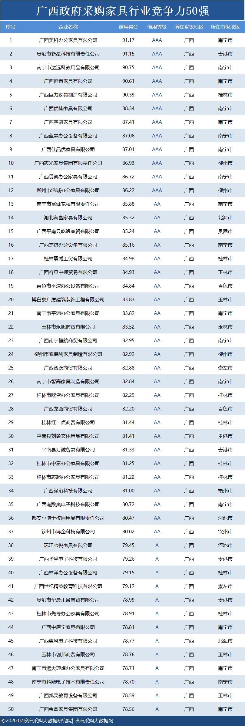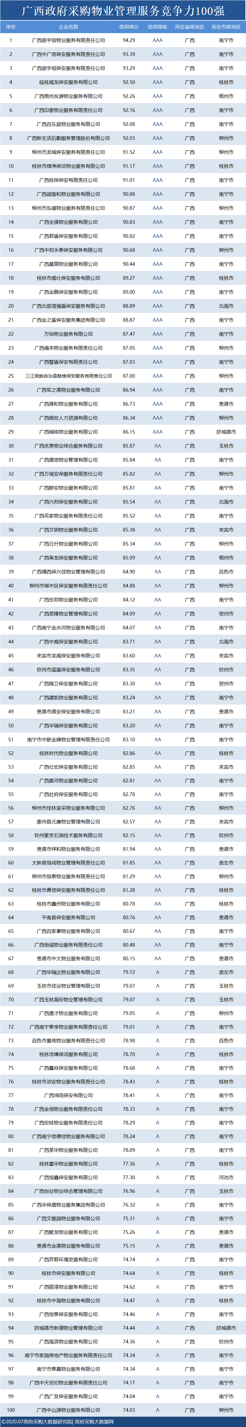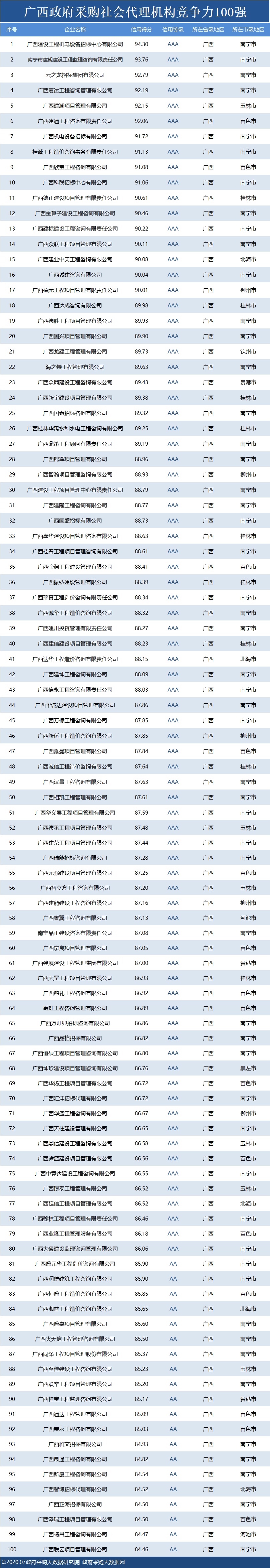 政府采购大数据研究院和政府采购大数据网联合发布:广西政府采购社会代理机构竞争力100强&物业竞争力100强&行业竞争力50强。数据评估区间:2019年07月01日至2020年6月30日。公示时间:2020年07月23日至2020年07月29日。