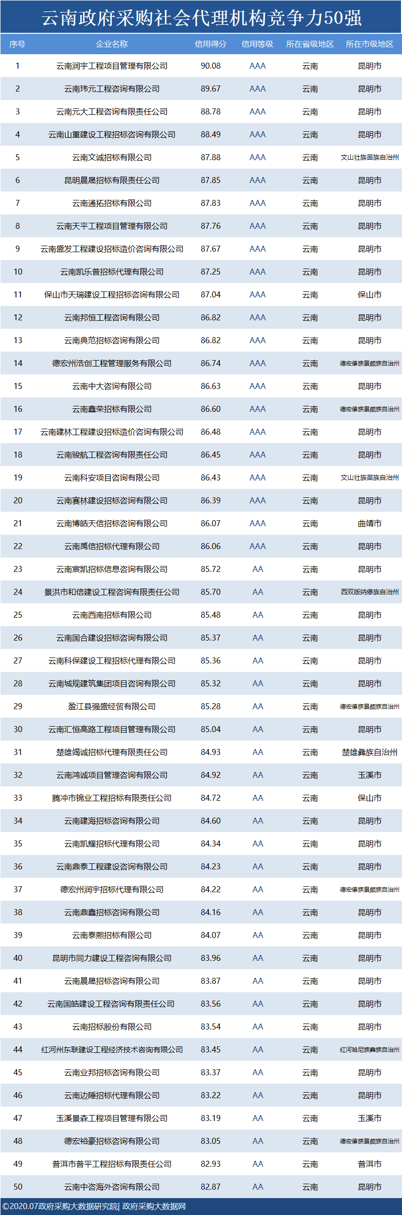 政府采购大数据研究院和政府采购大数据网联合发布:云南省政府采购社会代理机构竞争力50强&行业竞争力50强。数据评估区间:2019年07月01日至2020年6月30日。公示时间:2020年07月27日至2020年08月02日。