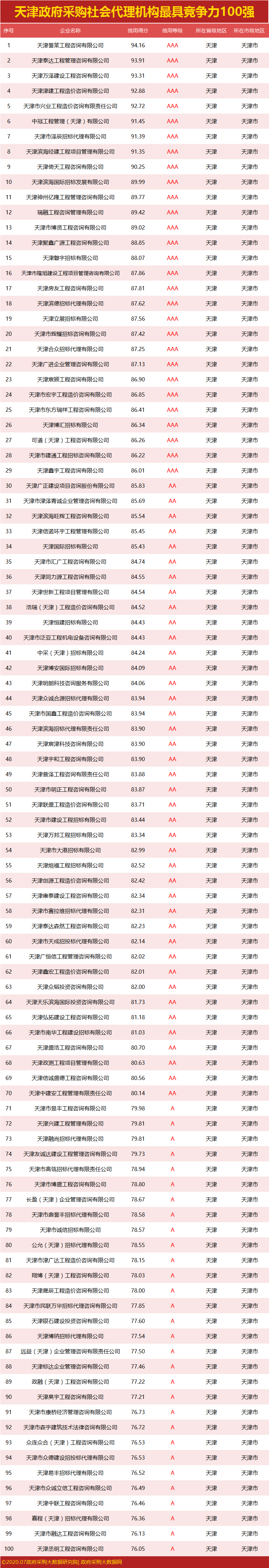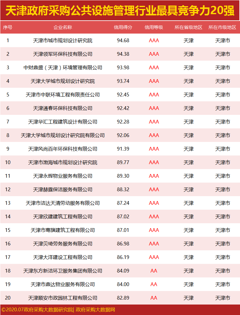政府采购大数据研究院和政府采购大数据网联合发布:天津市政府采购社会代理机构竞争力100强&行业竞争力20强。数据评估区间:2019年07月01日至2020年6月30日。公示时间:2020年08月06日至2020年08月12日。