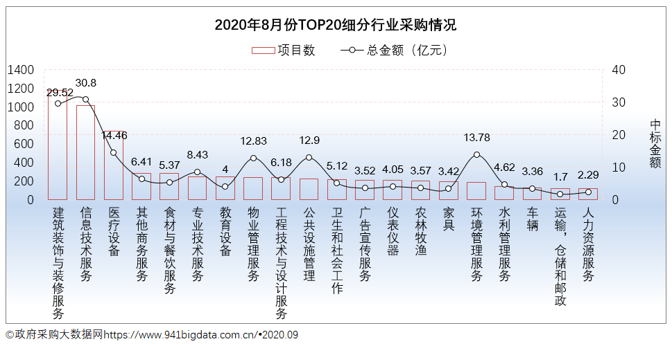 从项目数TOP20采购细分行业来看,2020年8月份广东政府采购细分行业排在前三的有:建筑装饰与装修服务、信息技术服务、医疗设备。